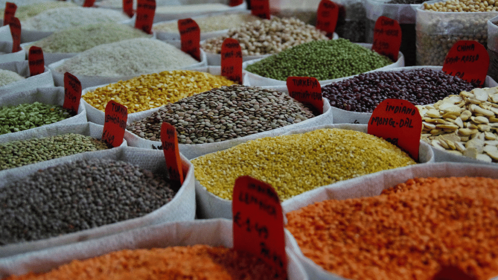 We import spices (Dry Red Chilli, Cumin, Coriander, etc.), groundnuts, chickpeas, pulses, fresh produce, and raisins.